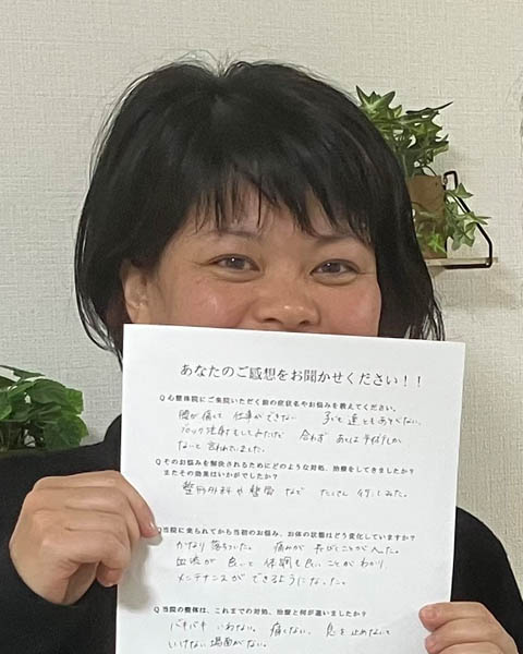 同じように苦しんでいる方、あきらめずに施術を受けて、少しでも痛みのない生活を手に入れてほしいです。